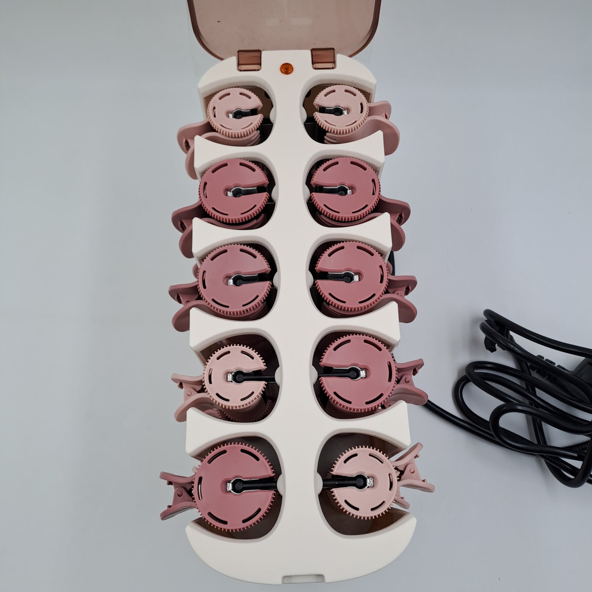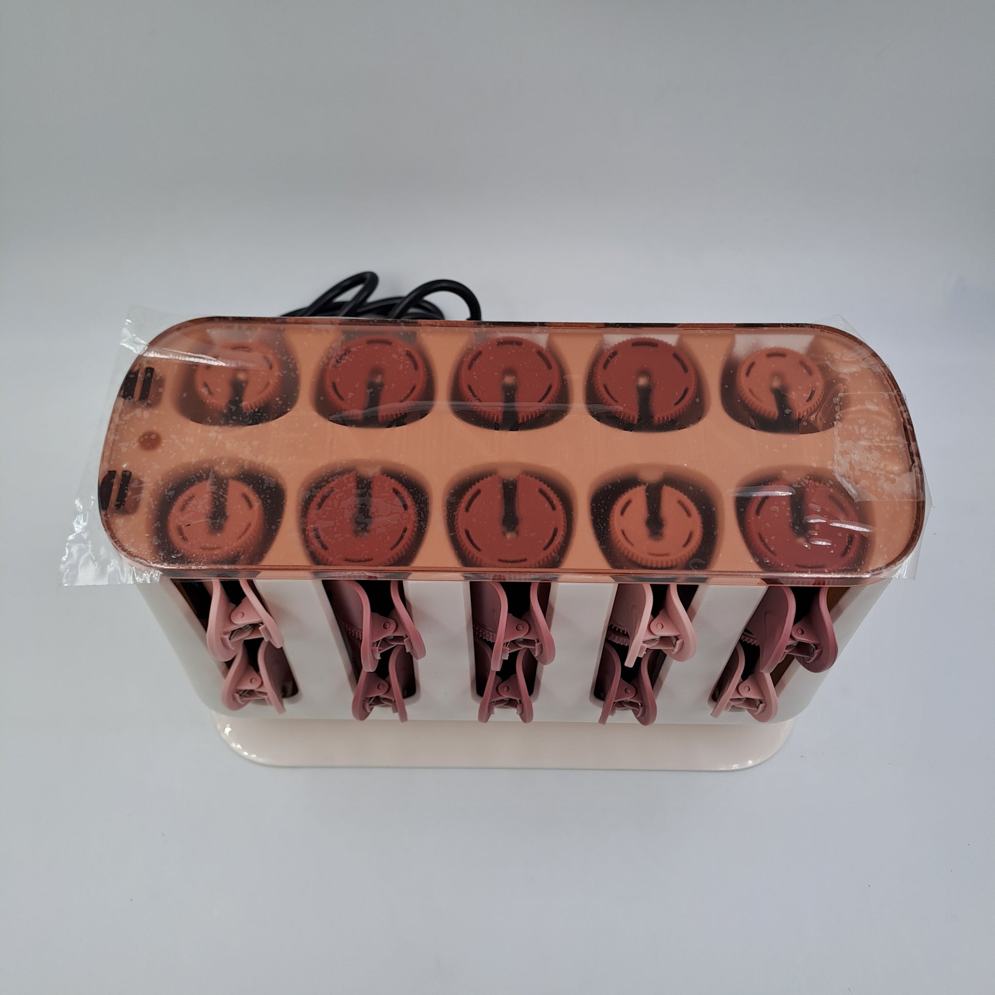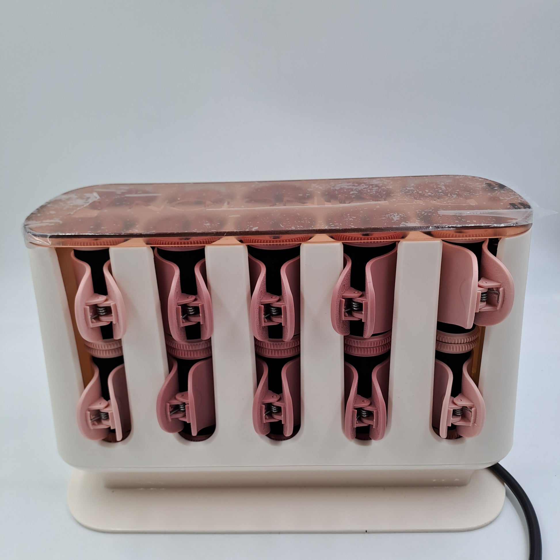 The device appears complete and structurally intact . The curlers are properly seated, and the clips are present and functional. There are no obvious breaks or damage. The lid still has its protective film . Any minimal signs of use are consistent with normal previous use.