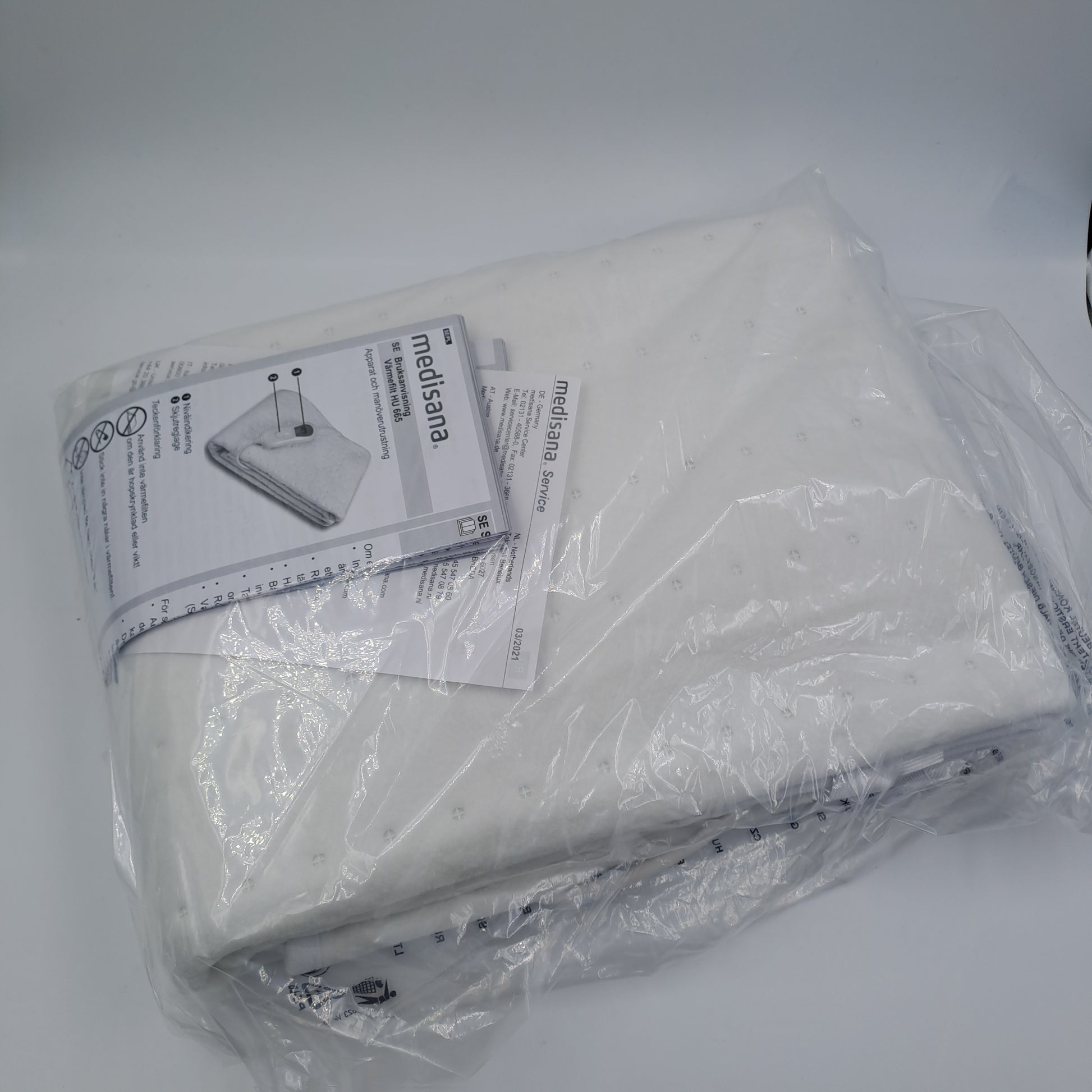 Scaldaletto elettrico Medisana modello HU 665, colore bianco, dimensioni 150 x 80 cm. Il prodotto è visibile in foto all’interno della busta protettiva trasparente con manualistica inclusa.