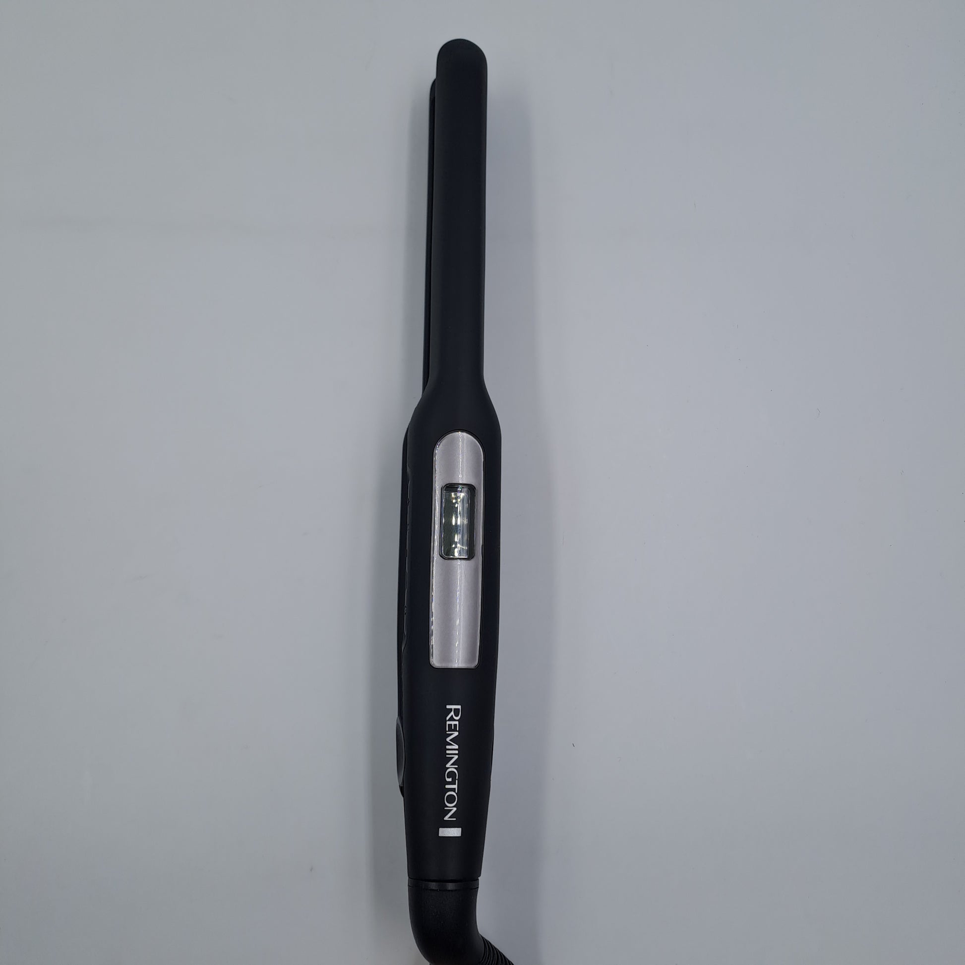 Piastra per capelli Remington Pro-Ceramic Extra Slim dal design nero opaco. Dotata di piastre sottili per styling di precisione e display digitale integrato sul corpo. Nelle foto è visibile anche la custodia morbida nera e la scatola originale del prodotto.
