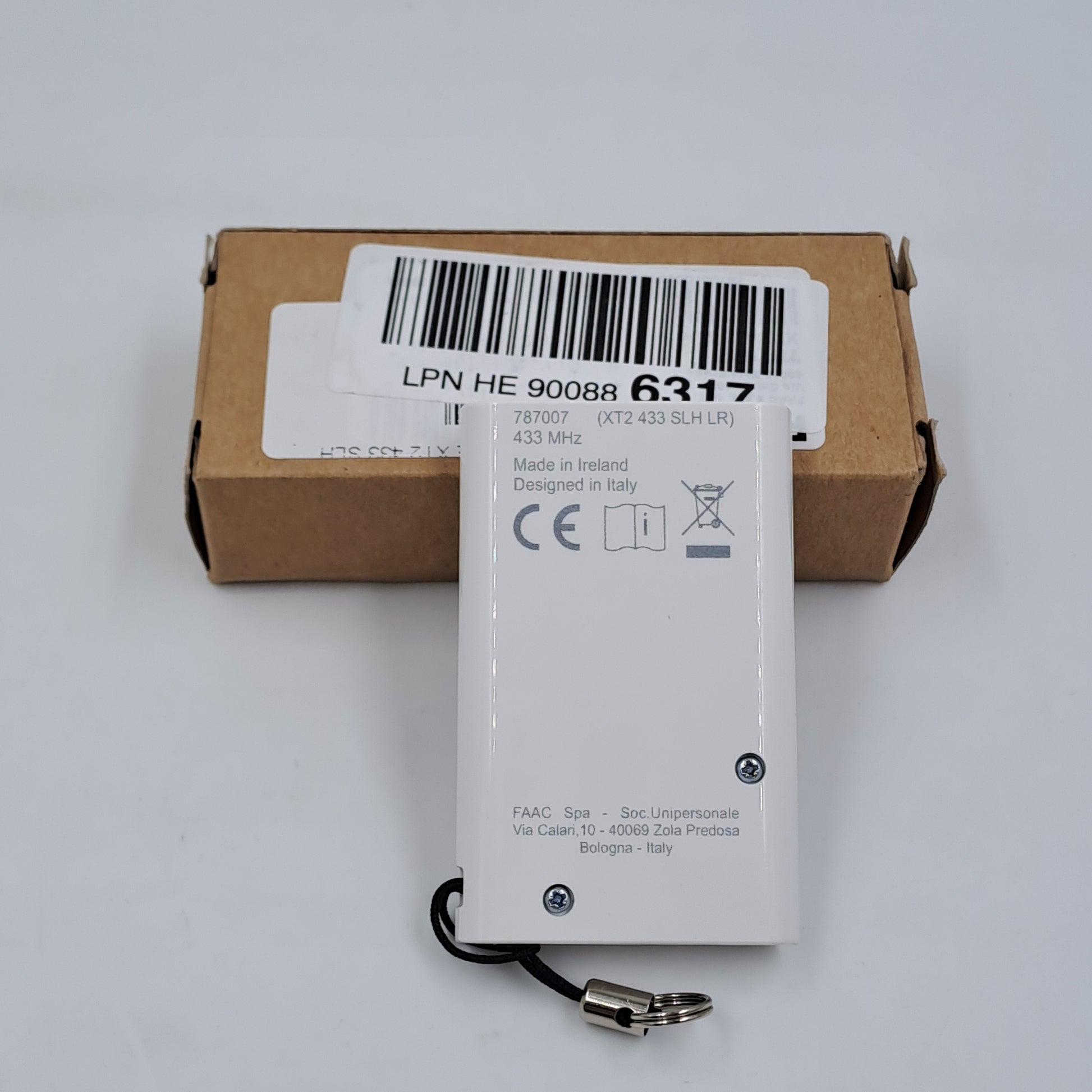 Dalle immagini si nota chiaramente il marchio FAAC sul frontale e sul retro del dispositivo, insieme alle marcature di conformità CE. Il prodotto risulta corredato di laccetto con anello portachiavi, ideale per essere trasportato comodamente.